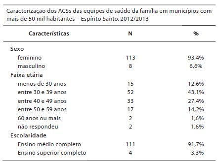 No que diz respeito à formação dos ACSs, a escolaridade predominante foi o ensino médio completo (91,7%). Ainda que tenha se verificado um aumento na escolaridade do brasileiro nos últimos anos, é importante salientar que, com a implantação do Programa Saúde da Família, ampliou-se o papel desses profissionais, com a exigência de novas competências no campo social e político, o que requer um grau de escolaridade mais complexo e abrangente. Marzari, Junges e Selli (2011) destacam a preocupação dos ACSs em relação ao elemento qualificação, pois reconhecem a necessidade de profissionalização como unânime no discurso desses atores. Os autores ressaltam que a profissionalização e a qualificação do ACS é um fator importante na constituição do seu trabalho cotidiano, mas alertam que a dificuldade em criar uma identidade legítima no trabalho pode levá-lo a buscar conhecimentos que se equiparam aos saberes dos outros profissionais da equipe.