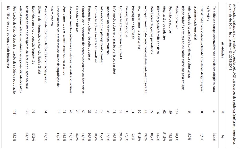 A análise do perfil dos ACSs da ESF no estado do Espírito Santo revelou um trabalhador híbrido que fundamenta o seu trabalho nas atribuições definidas pela Política Nacional de Atenção Básica, com predomínio das atividades de visita domiciliar, reunião de equipe, atualização dos cadastros e formulários institucionais e acompanhamento dos grupos de risco definidos pelo Ministério da Saúde.