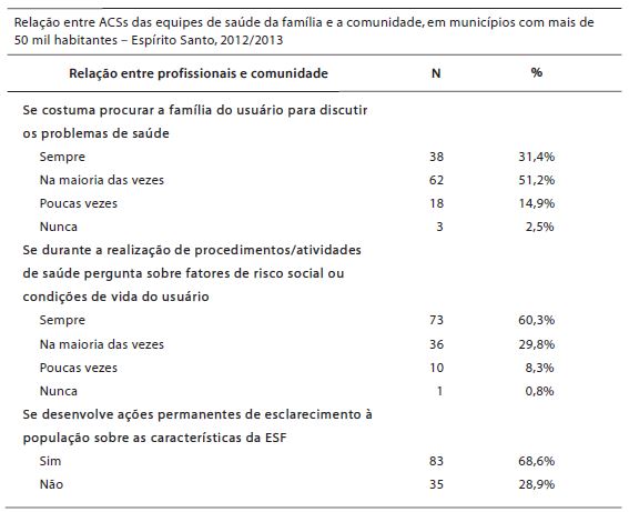 A pesquisa aqui apresentada encontrou resultados satisfatórios no tocante à relação entre os ACSs e a comunidade. Na Tabela 3, observa-se que 51,2% dos agentes afirmaram que costumam procurar a família do usuário para discutir os problemas de saúde, o que ocorria na maioria das vezes, enquanto 31,4% declararam que o faziam sempre.