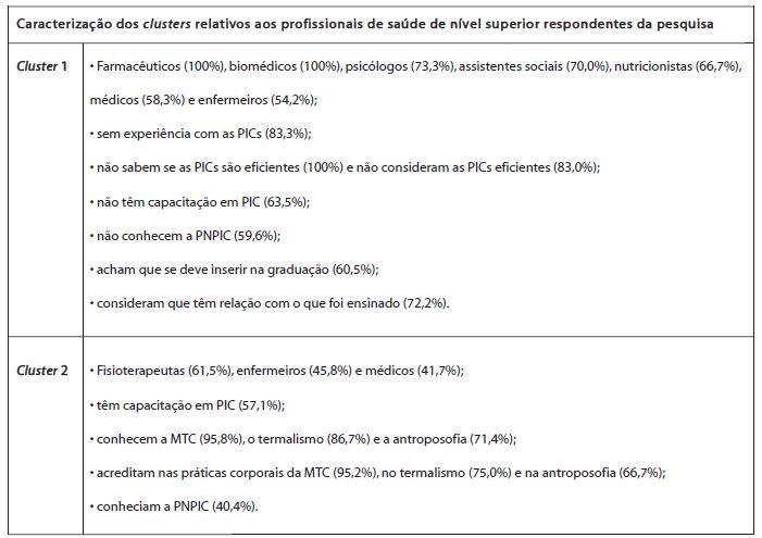 Os clusters obtidos apresentaram dois grupos distintos entre si e com dados semelhantes dentro de cada agrupamento. Assim, o cluster 1 continha a maioria das categorias profissionais, os que relataram não ter conhecimento sobre as PICs, nem sobre a PNPIC. Também era composto pela maioria dos que não tiveram capacitação e que achavam que o ensino das PICs deveria acontecer na graduação. Também continha a maioria dos que não sabiam ou não consideravam as PICs eficientes. O cluster 2 continha a maioria dos que tinham capacitação e dos que conheciam o termalismo e a antroposofia e dos que acreditam nas práticas corporais da medicina tradicional chinesa. Continha, ainda, os que conheciam a PNPIC.