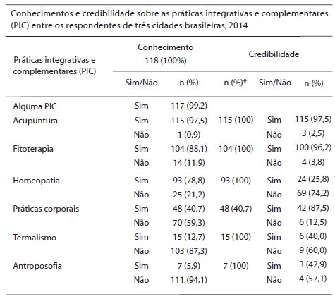 As práticas mais desconhecidas na pesquisa aqui apresentada foram: antroposofia (94,1%) e termalismo (87,3)%. Ainda assim, entre aqueles que dispunham de algum conhecimento sobre essas modalidades, nem metade tinha credibilidade nelas. Vale destacar que essas duas práticas passaram a integrar a proposta da PNPIC apenas em sua fase final de aprovação pelo Conselho Nacional de Saúde, e mesmo enfrentando resistências, a medicina antroposófica teve sua aprovação de forma isolada pela portaria GM n. 1.600, de 17 de julho de 2006, que constituiu o Observatório das Experiências da Medicina Antroposófica no SUS (Benevides, 2012).