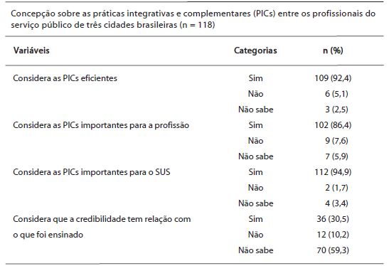 Dentre os profissionais entrevistados, 92,4% consideram as PICs eficientes; 86,4%, importantes para a profissão; 94,9%, importantes para o SUS; e apenas 30,5% atribuíram suas considerações ao que foi ensinado durante a graduação (Tabela 2).