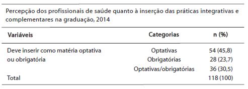 Questionados quanto à inserção das PICs nas matrizes curriculares, todos os participantes da pesquisa responderam que elas deveriam ser inseridas na graduação e distribuídas entre matérias optativas ou obrigatórias. Contudo, apenas 23,7% consideraram que elas deveriam ser obrigatórias no curso (Tabela 3).