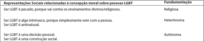 As RS das pessoas LGBT constituídas por concepções morais da homossexualidade, fundamentadas principalmente nas morais religiosas e heterônomas, também foram evidenciadas em pesquisas com diferentes grupos de participantes, referendando o preconceito socialmente compartilhado (Moreira e Gomes, 2013; Pereira et al., 2013; 2011; Lacerda, Pereira e Camino, 2002).
