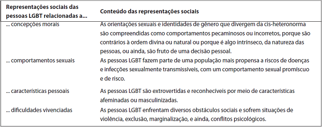 Os resultados mostraram que a população LGBT é representada por meio (1) das concepções morais sobre as orientações sexuais e identidades de gênero; (2) de determinados comportamentos sexuais; (3) de características pessoais; e (4) de dificuldades que são atribuídas à vivência como pessoas LGBT.
