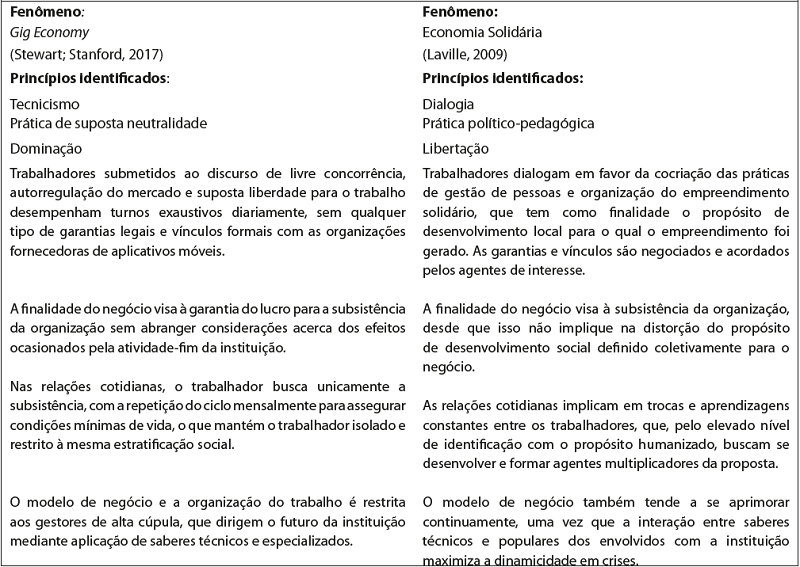 Pelo exposto, nota-se que a análise de implicação não é única, nem um modelo fechado. Trata-se de uma proposta dinâmica que se delineia por meio da compreensão dos elementos que medeiam as realidades apreendidas entre saberes e discursos técnicos e populares. O importante na análise de implicação é incluir os múltiplos olhares sobre a questão e permitir que pontos de vista conciliatórios e discordantes - caso existam - sejam trazidos ao referencial analítico (Voronov e Yorks, 2015). Nos casos supracitados, há um mapeamento claro e distinto sobre princípios humanizados e transformadores para a Economia Solidária e de desumanização e dominação para a Gig Economy, que podem servir como disparadores para análises futuras.