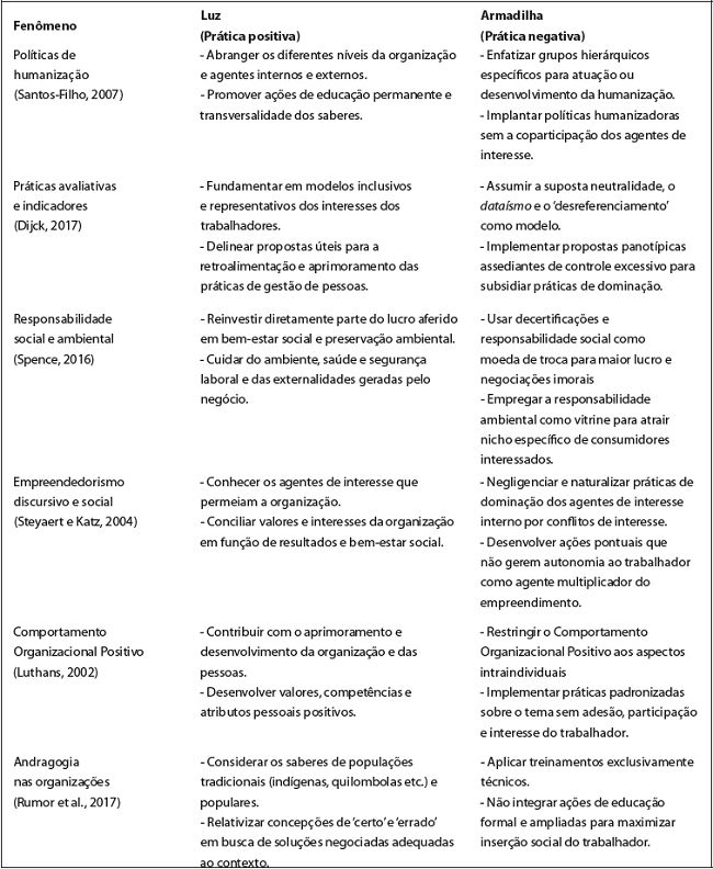 Com base nas alternativas expostas, verifica-se que frente às práticas organizativas e de gestão de pessoas é possível usar do mesmo aporte para promover a humanização ou resultar em práticas de dominação e exclusão, quando as propostas não são delineadas apropriadamente. A principal dificuldade ao tratar da humanização nas instituições é o uso da nomenclatura como rótulo para a prática organizativa e de gestão de pessoas, com o intuito de fomentar a 'maquiagem organizacional', mas sem assegurar os princípios humanizados que a norteiam (Araújo, 2009). Assim, ainda que a análise de implicação deva ser empregada como proposta contínua nas práticas de gestão de pessoas e organização do trabalho, deve-se destinar maior atenção para o referencial analítico nos casos supracitados, pois isso permite que os tensionamentos sejam apreendidos mais facilmente e, com isso, a humanização efetivamente aconteça nos espaços laborais rumo à 'luz' em vez de rumo às 'armadilhas' (Padilha, 2009).