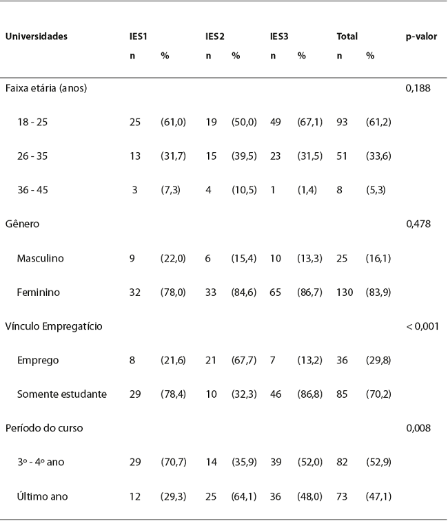 Na comparação da amostra entre as IESs, tiveram diferenças estatísticas significantes as variáveis: vínculo empregatício (p < 0,001), IES2 associada a discentes com vínculo empregatício (67,7%) e a IES3 àqueles sem vínculo empregatício (86,8%); período do curso (p-valor 0,008), IES1 associada a discentes do 3º ao 4º ano (70,7%) e IES2 aos do último ano (64,1%). Nas demais categorias não houve diferenças (Tabela 1). Embora 155 participantes tenham respondido o questionário, ao contabilizar as variáveis separadamente, observou-se variação no número de eventos devido à ausência de respostas em algumas das questões analisadas.
