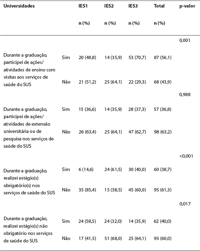 O estudo desenvolvido abordou a integração entre ensino e serviços públicos de saúde (Tabela 2) e diferenças significativas entre as IESs foram encontradas nas três modalidades: participação do discente em atividades de ensino com visitas aos serviços de saúde - a IES3 foi associada à maior participação dos discentes nestas atividades (70,7%); realização de estágios obrigatórios - a IES2 foi associada à maior participação dos discentes nesta modalidade de estágio (61,5%); realização de estágios não obrigatórios - a IES1 foi associada à maior participação dos discentes nesta modalidade (58,5%).
