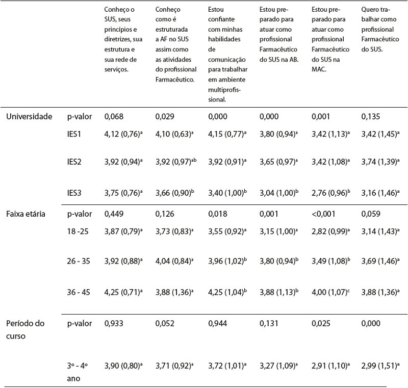 Afirmativas relativas aos conhecimentos e às habilidades para atuação no SUS tiveram variação, entre as IESs, quanto ao grau de concordância autorrelatada pelos discentes (Tabela 3). A IES3 apresentou médias significativamente inferiores às outras IESs nas questões que abordaram habilidades de comunicação para o trabalho multiprofissional (3,40 dp 1,00); preparo para atuação na atenção básica (3,04 dp 1,00); e preparo para atuação na média e alta complexidade (2,76 dp 0,96). A IES3 também evidenciou média significativamente inferior para a questão sobre os conhecimentos da estrutura da AF e das atividades do profissional farmacêutico no SUS (3,66 dp 0,90), quando comparada com a média da IES1 (4,10 dp 0,63).