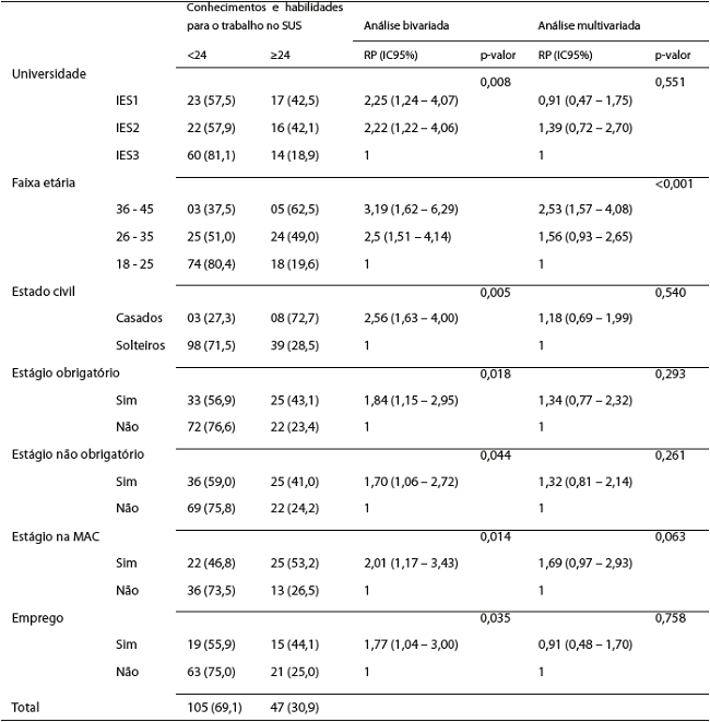 A força de associação das variáveis na alteração do conjunto das questões relativas aos conhecimentos e às habilidades para atuação no SUS, foi igualmente analisada. Na análise bivariada, encontrou-se associação positiva e estatisticamente significativa para autopercepção de preparo para o trabalho no SUS e as seguintes variáveis: IES, faixa etária, estado civil, estágio obrigatório no SUS, estágio não obrigatório no SUS, estágio na MAC e vínculo empregatício. Contudo, após a realização da análise multivariada, apenas o fator idade manteve associação positiva e estatisticamente significativa, em que discentes de 36 a 45 anos sentiram-se 2,53 vezes mais preparados para atuarem no SUS na comparação com aqueles de até 25 anos (Tabela 4).