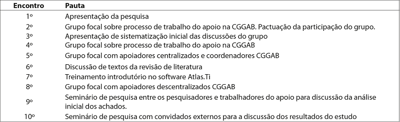 No período do estudo a equipe da CGGAB era composta por 21 apoiadores centralizados, 7 descentralizados e 2 coordenadores. As entrevistas e os grupos focais foram realizados no local de trabalho dos profissionais após a assinatura do termo de consentimento livre e esclarecido, e seguiu perguntas disparadoras previamente definidas. No total, foram realizadas 17 entrevistas de apoiadores centralizados; 4 entrevistas com apoiadores descentralizados; 2 entrevistas com dirigentes; 2 grupos focais com os trabalhadores centralizados do apoio; e 1 grupo focal com apoiadores descentralizados.