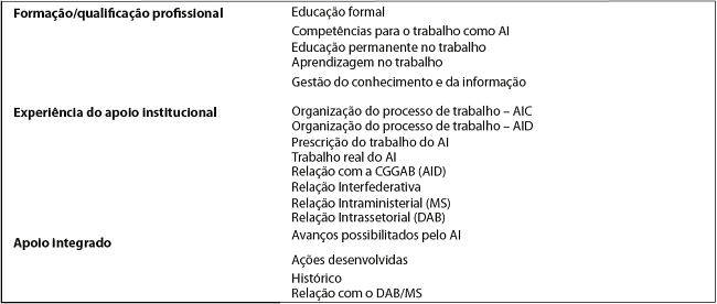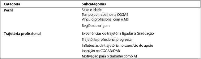 Os documentos provenientes da coleta de dados (transcrições das entrevistas e grupo focal) foram inseridos no software Atlas.Ti, para qual criou-se uma unidade hermenêutica denominada ‘Apoio Institucional’. Empregaram-se as seguintes nomenclaturas: AIC (apoiador institucional centralizado); AID (apoiador institucional descentralizado); e G (grupo focal). Após esta etapa, foram realizadas as leituras dos documentos e a codificação. Os codes, de acordo com a linguagem do software, representam as unidades de registro (palavra, tema ou ‘núcleos de sentido’ para representação de um conteúdo), que facilitam o encontro dos trechos das falas (quotations) dos entrevistados, relacionadas a determinado tema. No presente estudo, foram definidas as categorias e subcategorias de análise apresentadas no Quadro 2 a seguir.
