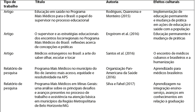 Os estudos mencionados não trataram exatamente de currículo, mas da possibilidade de aprendizagem e mudança no contexto do PMM, em uma perspectiva que aborda a relação currículo/educação para médicos e mudanças nas práticas realizadas nas unidades de saúde que receberam os médicos do Programa, por isso foram escolhidas para estudo.