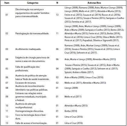 Após a categorização detalhada do conteúdo dos 22 artigos selecionados, foram identificadas 13 categorias que tratam de ideias em comum em relação aos desafios no acesso à saúde da população trans no Brasil, apresentadas abaixo no Quadro 1: