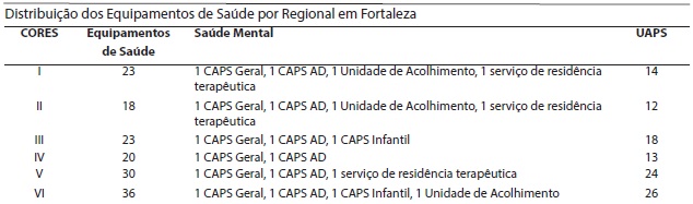 A escolha para este estudo delimitou a participação de seis unidades de atenção primária à saúde e seis centros de CAPSs de todas as CORESs de Fortaleza.