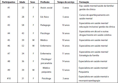 Participaram do estudo dez profissionais de nível superior dos CAPSs, que tinham mais de dois anos de trabalho na saúde mental e não estavam em desvio de função. Os participantes contemplaram os diversos serviços de saúde mental da cidade (CAPS III, AD III e IJ), uma diversidade de profissões, sendo comum a todos o vínculo de trabalho estatutário e o perfil de uma formação específica em saúde mental. Dentre os participantes, sete eram mulheres e três homens, identificados por uma numeração de 1 a 10 antecedida pelo símbolo # ( Quadro 1 ).