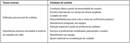 De modo geral, os profissionais relataram diversos aspectos que, na sua concepção, caracterizavam o cuidado psicossocial, tais como a atenção em rede, o trabalho em equipe, a necessidade de centralizar as ações nos usuários e a integralidade do cuidado. Dentre as principais unidades de sentido da subcategoria ( Quadro 2 ), os profissionais também descreveram experiências exitosas que os influenciavam nessa percepção e identificaram desafios para consolidar o cuidado psicossocial.