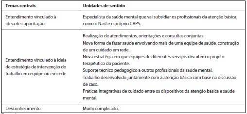 Os relatos evidenciaram a existência de diferentes perspectivas sobre o apoio matricial entre os profissionais, ora como estratégia de ordenação do cuidado em saúde mental, ora como mais uma das tarefas ou ações que deveriam ser desempenhadas. O quadro 3 mostra os pontos centrais levantados pelos relatos dos profissionais nessa subcategoria.