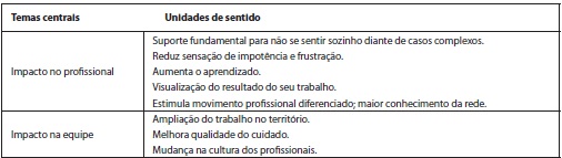 Como evidenciam as falas a seguir, as experiências de apoio matricial desses profissionais trouxeram impactos positivos na equipe, fortalecendo a perspectiva psicossocial no atendimento do paciente e impondo o questionamento da permanência de práticas asilares e centradas no serviço.
