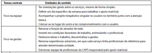 Ainda quanto à organização do apoio matricial, os profissionais indicaram ações específicas a serem adotadas pela gestão, com base em suas experiências anteriores. Por exemplo, vários trabalhadores entendiam que a função de ativador de rede deveria ser retomada. Além disso, havia a necessidade da manutenção de condições favoráveis de trabalho que estimulassem os profissionais e desburocratizassem os processos de trabalho.