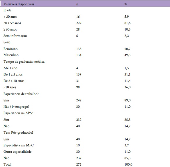 Os dados foram coletados com aplicação de questionário estruturado, intitulado “Mais Médicos − Formulário de Avaliação”, que é parte do projeto de pesquisa ”Análise político-social da implantação do Programa Mais Médicos no Estado da Paraíba”. O questionário foi enviado e respondido em formulário eletrônico na internet, via convite individual, para todos os 398 médicos. Apesar desse universo, foram validados apenas 272 questionários.