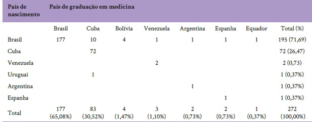A Tabela 2 apresesenta o quantitativo de médicos por país de nascimento e de realização do curso de medicina. No que tange à nacionalidade, 71,7% são brasileiros, 26,5%, cubanos e 1,8%, de outros países. E com relação ao local onde foi feita a graduação em medicina, 65,1% se formaram no Brasil, 30,5%, em Cuba, e os demais em países de língua espanhola especificados na referida tabela. Dentre os 95 profissionais graduados no exterior (34,9%), 18 são brasileiros (6,6%).