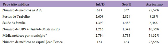 Na Paraíba como um todo, os valores encontrados foram 0,478 (em julho de 2013) e 0,356 (em setembro de 2015). A redução desse Índice (razão entre médicos na APS/mil habitantes do conjunto de municípios da Paraíba) aponta melhor distribuição de médicos nesse estado.