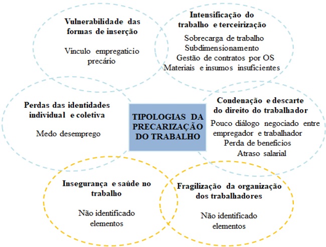 A fim de identificar e compreender a precarização do trabalho no âmbito da AB, exploramos seis tipologias elaboradas por Druck e Franco, descritas a seguir: Vulnerabilidade das formas de inserção e desigualdades sociais – diz respeito aos modos de mercantilização da força de trabalho que produzem um mercado de trabalho heterogêneo, segmentado, marcado por uma vulnerabilidade estrutural e com contratos precários, sem proteção social; intensificação do trabalho e terceirização – por esta intensificação, impõe-se ao trabalhador condições precárias sustentadas na terceirização, assédio moral e abuso de poder; insegurança e saúde no trabalho – resulta de padrões de gestão que desrespeitam o necessário treinamento, em detrimento ao aumento da produtividade a qualquer custo; perda das identidades individual e coletiva – tem suas raízes na condição de desempregado e na ameaça permanente da perda do emprego, que tem se constituído numa eficiente estratégia de dominação ; fragilização da organização dos trabalhadores – pode ser identificada no enfraquecimento de organização sindical e de luta pelos direitos, em decorrência da alta concorrência laboral, e heterogeneidade de vínculos; condenação e descarte do direito do trabalhador – expressa-se no ataque às formas de regulamentação do Estado, através das reformas que atacam as leis trabalhistas vigentes com seus ‘princípios’ liberais de defesa da flexibilização, como processo inexorável trazido pela modernidade dos tempos de globalização (Druck e Franco, 2009).
