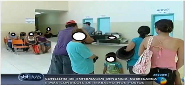 A Figura 3 apresenta uma UBS vistoriada pelo Conselho de Enfermagem após denúncia de sobrecarga e más condições de trabalho das trabalhadoras da enfermagem. A imagem ilustra usuários que aguardam por atendimento na recepção, sentados e em pé, evidenciando o número de cadeiras insuficientes para sua acomodação.