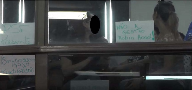 A imagem ilustra a ocupação da Câmara de Vereadores do município de Cuiabá por trabalhadores da enfermagem que atuam na Estratégia Saúde da Família, em protesto contra a perda da gratificação. Percebemos que a imagem apresenta trabalhadoras do sexo feminino, que estão sentadas em cadeiras, e que apresentam postura corporal lateralizada que evidencia interação entre elas. A imagem contêm protestos realizados por cartazes fixados nas vidraças com os seguintes conteúdos descritos: PSF Presente, Não a gestão Robin Hood!, Enfermagem PSF + Gratificação, demonstrando, deste modo, as pautas de reivindicação.