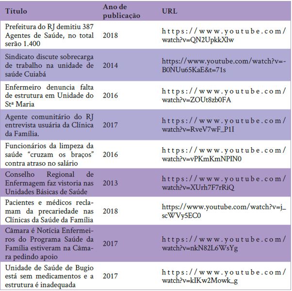 O campo empírico explorado para a realização dessa pesquisa foi a plataforma Youtube. A busca de vídeos no sítio do Youtube seguiu o processo metodológico proposto por Garcia (2017), por meio da inserção do conjunto de termos “precarização, estrutura inadequada, atenção básica” e “precarização, terceirização, atenção básica” na própria caixa de pesquisa da plataforma, que resultou em 24 vídeos encontrados. Desses 24 vídeos, 09 foram selecionados para constituir o corpus desta pesquisa (Quadro 1), pois obedeceram aos seguintes critérios de inclusão: apresentaram narrativas e imagens que se relacionaram com as tipologias da precarização do trabalho, postados na plataforma desde 2013. A coleta dos dados foi realizada de julho de 2018 a janeiro de 2019.