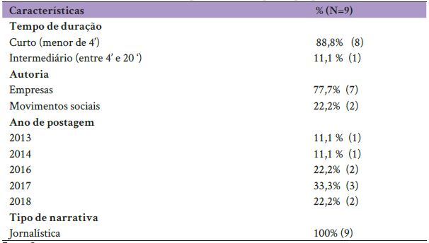 Conforme demonstra a Tabela 1, nesta pesquisa houve o predomínio de vídeos de curta duração (88,8 %), constituídos por meios de comunicação televisivos (22,2%) e vídeos administrados por movimentos sociais. Os serviços da AB que aparecem nos vídeos foram Unidades Básicas de Saúde (UBS) tradicionais e com Estratégia Saúde da Família (ESF). Quanto ao ano de postagem, 2017 se destaca com (33,3%) dos vídeos postados. Sobre as categorias profissionais expostas, em quatro vídeos aparecem enfermeiras e técnicas de enfermagem, em dois vídeos, Agentes Comunitários de Saúde (ACS), em outros dois vídeos, funcionários da higienização e serviços gerais e em um vídeo, o profissional médico.