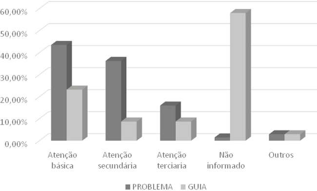 Quanto à complexidade dos serviços presentes nos contextos das situações-problema e guias, a maior parte dos contextos não foram informados (Gráfico 1). Houve, também, situações-problema que exploraram outros contextos além da área da saúde, como a área da educação.