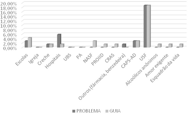 Quanto à utilização dos equipamentos sociais, observam-se três pontos semelhantes entre as situações-problema e os guias (creche, Caps-AD e USF) mantendo coerência com os objetivos de aprendizagem. Porém, também se identificam descompassos em relação a outros três (escolas, hospitais e farmácia). Observa-se que nestes três elementos, os guias não retomam a discussão na mesma proporcionalidade com que apareceram nas situações-problema e, consequentemente, não ajudam a construir o conhecimento. Percebe-se que, em seis elementos (Núcleo de Apoio à Saúde da Família – NASF, Programa Interdisciplinar de Internação Domiciliar – PROIID, Centro de Referência de Assistência Social – CRAS, Alcoólicos anônimos, Amor exigente e Esquadrão da vida), os guias foram além dos pontos abordados pelas situações-problema, referenciando equipamentos sociais diferentes dos que as situações-problema induziram. Quando uma informação aparece no guia e não aparece na situação-problema, dificilmente torna-se significativa para o estudante.