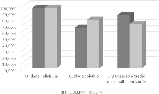 Quanto às áreas de competência (Gráfico 3), observa-se um ponto de semelhança entre as situações-problema e os guias na área de competência do cuidado individual. Percebe-se que todos os elementos presentes no RADS foram abordados pelas situações-problema e pelos guias. Identifica-se, ademais, que, na área de cuidado coletivo, o guia esperava mais do que as situações-problema possibilitaram. Na área de organização e gestão, os guias não valorizaram todos os pontos abordados pelas situações-problema.