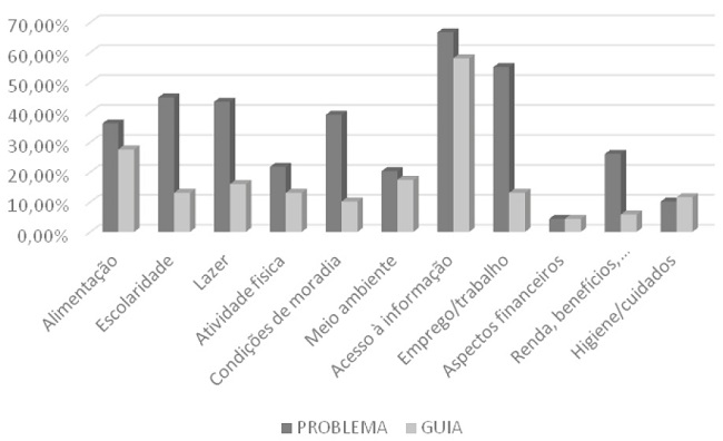 Quanto às condições de vida, com relação aos aspectos socioambientais (Gráfico 4), observou-se que todos os elementos presentes no RADS foram referenciados pelas situações-problema e pelos guias. Porém, verificou-se coerência entre situação e guia apenas em um dos 11 itens elencados, o aspecto financeiro. Os elementos com maior divergência entre os conteúdos das situações-problema e guias foram a escolaridade, o lazer, as condições de moradia, o emprego e trabalho e a renda e benefícios, os quais apareceram nas situações-problema, mas não foram valorizados nos guias.