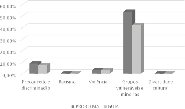 Identificou-se que o elemento ‘grupos vulneráveis e minorias sociais’ foram os mais representados deste Eixo nas situações-problema e nos guias. Esta temática foi elencada no RADS na busca de se reconhecer a pluralidade existente no campo das relações humanas, bem como compreender que são indivíduos suscetíveis de serem ofendidos e não considerados.