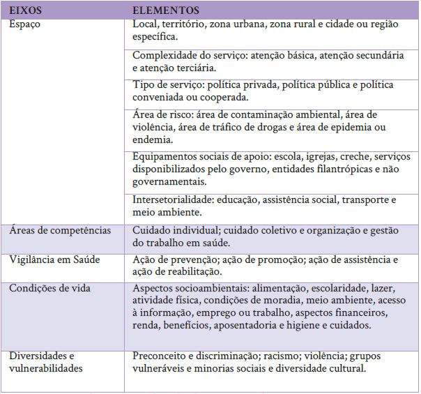 Neste artigo, são abordados os seguintes eixos relacionados diretamente ao contexto: espaço, áreas de competência, vigilância da saúde, condições de vida – aspectos socioambientais – e as diversidades e vulnerabilidades.