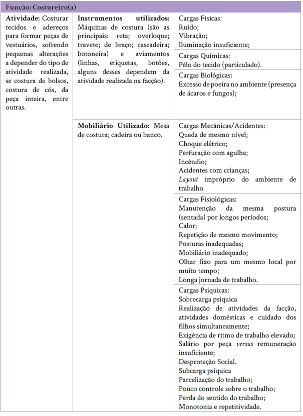 As considerações anteriores nos permitem relacionar o processo de desgaste com a violação do fundo de vida do trabalhador, visto que as condições e a organização do trabalho nas facções não se alteraram significativamente nos últimos anos, como mostraram os estudos de Lindôso e Amaral (2009) , Alves e Souza (2010) , Rodrigues (2010) , Costa (2011 , 2012 ), Souza (2012) , Carvalho e Silva (2015) , Silva (2017) em comparação com o nosso. Portanto, a superexploração da força de trabalho potencia o aparecimento de cargas de trabalho e o consequente desgaste precoce dos trabalhadores.