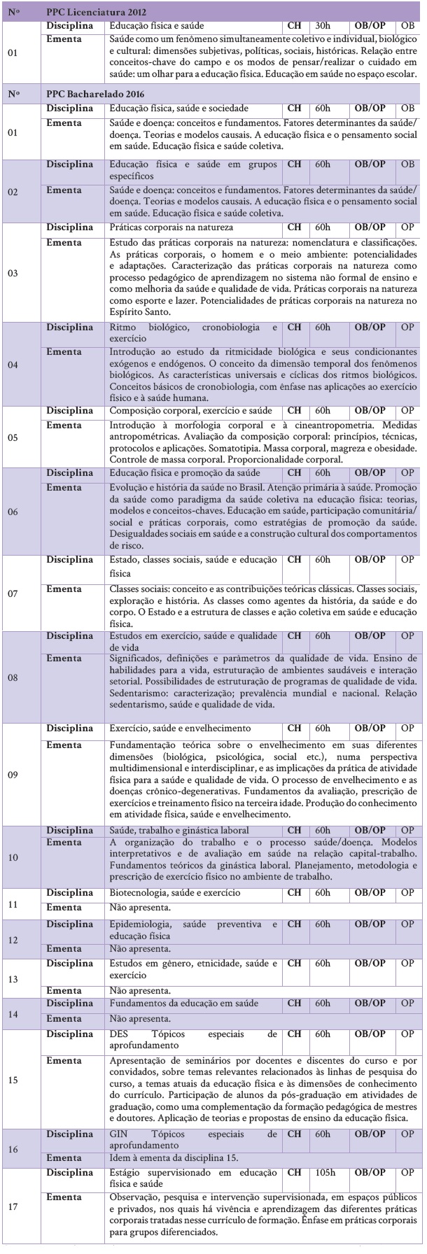 Apesar de um cenário que confere maior número de disciplinas relacionadas ao tema da saúde no curso de bacharelado caracterizar o CEFD/UFES e da configuração das novas DCNs, observa-se com Neves e colaboradores (2015) que ambos os cursos deveriam almejar uma aproximação com a saúde coletiva e, assim, reorientar a formação em consonância com os princípios do SUS. Com essa premissa, passamos a analisar as disciplinas obrigatórias dos cursos.
