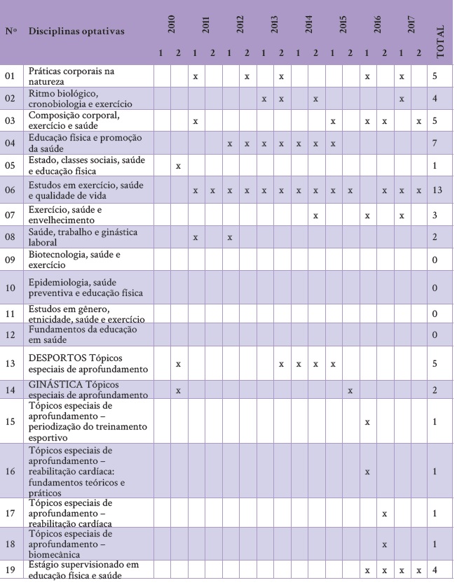 Fonte: Documento com disciplinas optativas da área de esporte entre 2010/1 e 2015/2; Documento com disciplinas optativas da área de saúde entre 2010/1 e 2015/2; grade de horário de oferta de disciplinas de 2016/1 a 2017/2.