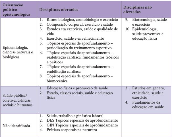 As disciplinas optativas ofertadas no curso de bacharelado são, majoritariamente, ligadas à orientação político-epistemológica em que se vinculam a epidemiologia e as ciências naturais e biológicas – ou seja, à tradição historicamente constituída na EF (Carvalho, 2005). Os dados demonstram que o número de disciplinas orientadas nessa base epistemológica tem uma presença maior em comparação com as disciplinas orientadas nas ciências sociais e humanas.6 No bojo da constatação de uma tradição construída historicamente, observa-se que esse contexto maior preserva a perpetração de uma reflexividade pautada nas ciências naturais e biológicas, o que parece acompanhar o estabelecimento dos currículos de formação do CEFD/UFES, inclusive no que concerne à abordagem do tema da saúde.