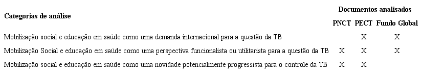 As categorias de análise expõem os documentos oficiais a contradições e sinalizam que não existe, seja na participação da população ou na educação em saúde em TB, a intencionalidade de discutir aspectos mais complexos ligados à produção social da doença. As condições e as experiências de vida da população, as iniquidades em saúde, as desigualdades socias e a vulnerabilidade social não parecem ser efetivamente problematizadas.