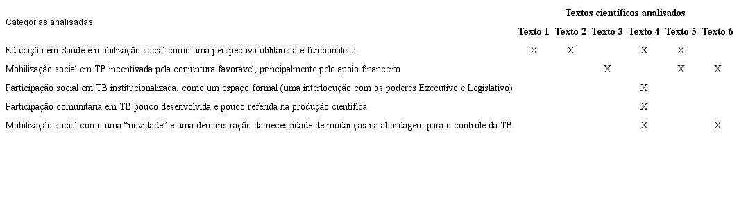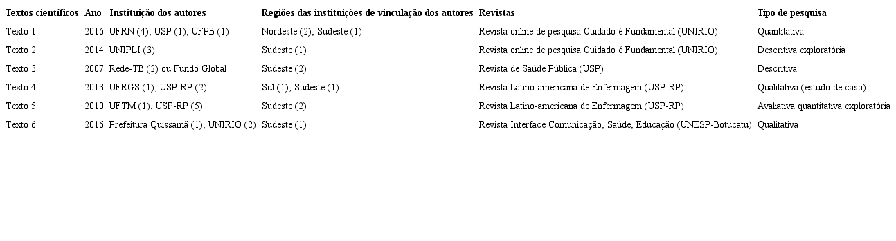 Os textos científicos foram enumerados de 1 a 6 para sua sistematização e análise: texto 1: Contribuição dos profissionais da atenção primária à saúde para o autocuidado apoiado aos portadores de tuberculose, de Andrade et al. (2016); texto 2: O enfermeiro e a educação em saúde no atendimento aos portadores de tuberculose na unidade básica de saúde, de Araújo, Saldanha e Colonese (2014); texto 3: Estratégias de controle da tuberculose no Brasil: articulação e participação da sociedade civil, de Santos Filho e Gomes (2007); texto 4: Organização social e controle da tuberculose: a experiência de um município brasileiro, de Bulgarelli, Villa e Pinto (2013); texto 5: Controle da tuberculose: percepção dos doentes sobre orientação à comunidade e participação comunitária, de Curto et al. (2010) e texto 6: Organizações Não Governamentais de tuberculose do Rio de Janeiro, Brasil: motivações e vínculos na primeira década do século XXI, de Santos, Souza e Cunha (2016).