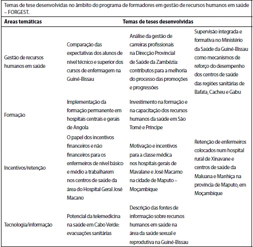 Essa primeira edição do FORGEST permitiu formar um conjunto de 22 profissionais (seis mulheres e 16 homens, com idades compreendidas entre 26 e 55 anos), oriundos de seis países, destacando-se a presença de vários diretores nacionais de RHS, um diretor de escola nacional de saúde pública e vários coordenadores regionais de RHS. Um subproduto do programa é o portal web FORGEST, que continua ativo e serve como fonte de informação e plataforma de comunicação entre os participantes. A boa integração dos vários parceiros institucionais permitiu desenvolver um programa de melhor qualidade e mais adaptado às necessidades dos participantes, levando-os a produzir trabalhos mais relevantes.