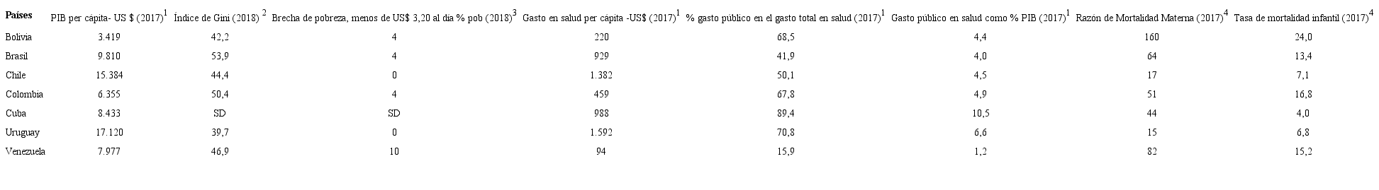 Las disparidades en la determinación social expresadas en los niveles de riqueza, desigualdades sociales, gasto en salud per cápita, gasto público en salud, los resultados en salud y las iniquidades sociales son enormes entre los países seleccionados, de acuerdo con los indicadores socioeconómicos y de salud mostrados en el Cuadro 1. En general, los países con mayor PIB per cápita, menores desigualdades de ingreso económico, menores brechas de pobreza, mayor gasto per cápita y mayor gasto público en salud como porcentaje del PIB, como lo son Uruguay, Chile y Cuba, tienen mejores resultados en salud medidos por mortalidad materna e infantil. En tanto que los países más pobres, socialmente más desiguales, con excepción de Bolivia, y menor gasto per cápita y público en salud, comparten peores resultados medidos por los mismos indicadores. En este grupo Brasil, que es un país moderadamente rico y con moderado gasto en salud per cápita, pero con altos niveles de desigualdad y el más bajo gasto público per cápita en salud, tiene resultados en salud regulares.