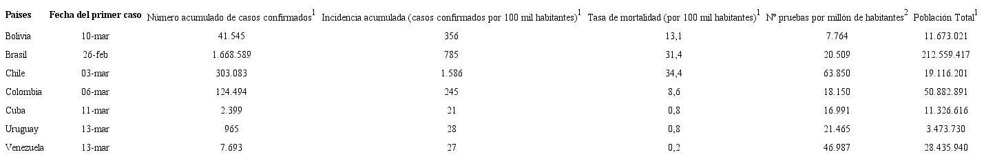 En este contexto, la pandemia por Covid-19 ha tenido diferente comportamiento, aunque es difícil comparar en todos los indicadores porque las definiciones de caso y las pruebas aplicadas son distintas entre ellos. Sin embargo, como observamos en el Cuadro 2, mientras Brasil reportó el primer caso el 26 de febrero (Brasil, 2020), Uruguay y Venezuela lo hicieron el 13 de marzo (Uruguay, 2020; Venezuela, 2020) y los demás países en fechas intermedias. Brasil, seguido de Chile y Colombia (Arroyo et al., 2020), ha tenido un crecimiento acelerado de casos, mientras Uruguay reporta una tendencia a estabilizarse (Uruguay, 2020), Cuba un comportamiento decreciente (Cuba, 2020) y Venezuela crece pero a un menor ritmo. La mayor incidencia acumulada por 100 mil habitantes se ha dado en Chile, Brasil, Colombia y Bolivia con tres dígitos, en tanto Cuba, Uruguay y Venezuela sólo han tenido uno. Chile es el país con el mayor número de pruebas aplicadas por millón de habitantes, estimado en 63.850, mientras que Bolivia es el que ha aplicadoel menor número con 7.764 pruebas (Bolivia, 2020). En cuanto a la mortalidad, Brasil y Chile son los países con las mayores tasas, 34.4 y 31.4 óbitos por cien mil habitantes respectivamente, en tanto Venezuela, Uruguay y Cuba tienen las menores, con 0.2, 0.8 y 0.8 en su orden.