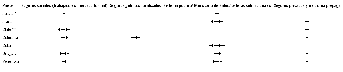 Con pocas excepciones, y resaltando a Cuba, las características centrales de los sistemas de salud en Latinoamérica son la fragmentación de la protección social en salud, la baja participación del sector público en la financiación de ésta, la segmentación y descoordinación de las redes asistenciales, además de la privatización creciente del aseguramiento y de la prestación de los servicios de salud (Giovanella et al., 2012; Machado e Lima, 2017). No obstante, los siete países estudiados tienen particularidades a destacar según el tipo de financiamiento y garantía para el acceso (seguro social, seguro público focalizado, seguro nacional, seguro privado, estatal/fiscal, y las combinaciones anteriores), la naturaleza de los prestadores de servicios (pública, privada, cooperativas/mutuales, y las combinaciones de las anteriores), y el tipo de APS (integral, selectiva, básica/primer nivel) que organiza el modelo de atención (Giovanella y Mendonça, 2012).
