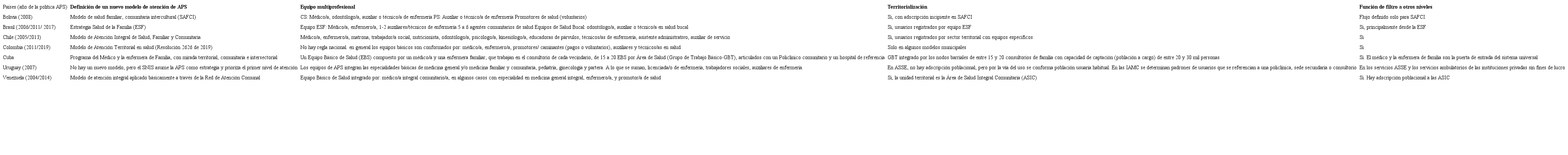En las últimas décadas han sido diseñados, y en algunos casos implementados, nuevos modelos de APS en los países de América Latina con elementos comunes: equipos multiprofesionales con enfoque familiar, comunitario y territorial (Giovanella y Almeida, 2017; Acosta Ramírez et al., 2016). En cinco de los países estudiados, la APS fue propuesta como base de un sistema universal. El componente comunitario de la APS fue expresado en las políticas nacionales, con territorialización en 5 países, y con la incorporación de agentes comunitarios de salud (remunerados o voluntarios) en 3 países (Cuadro 5).